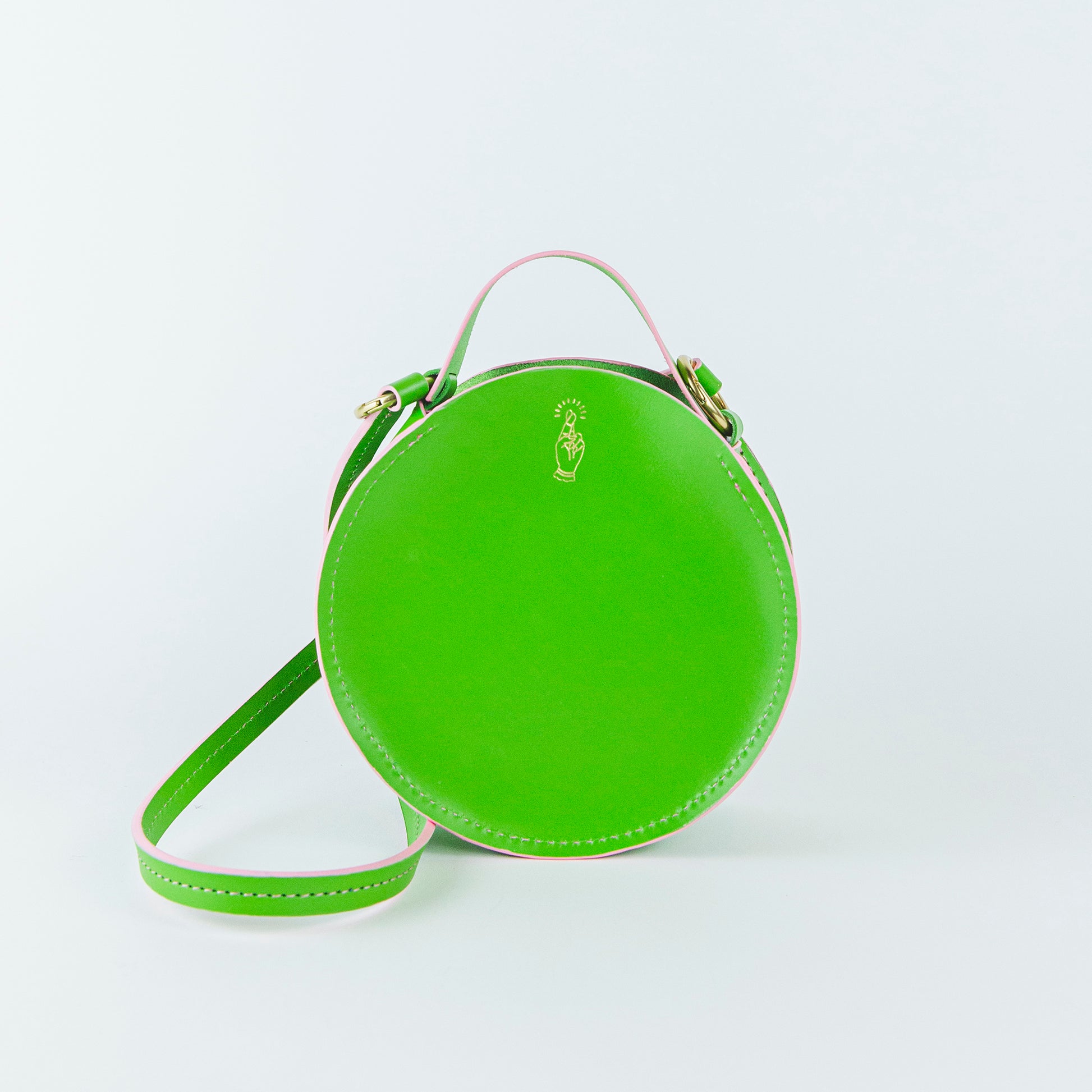 Circular leather handbag.